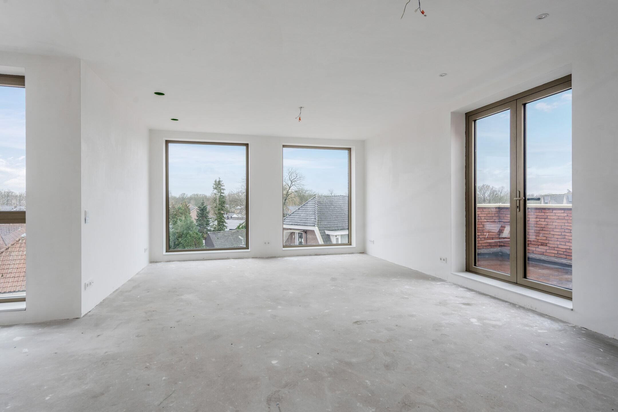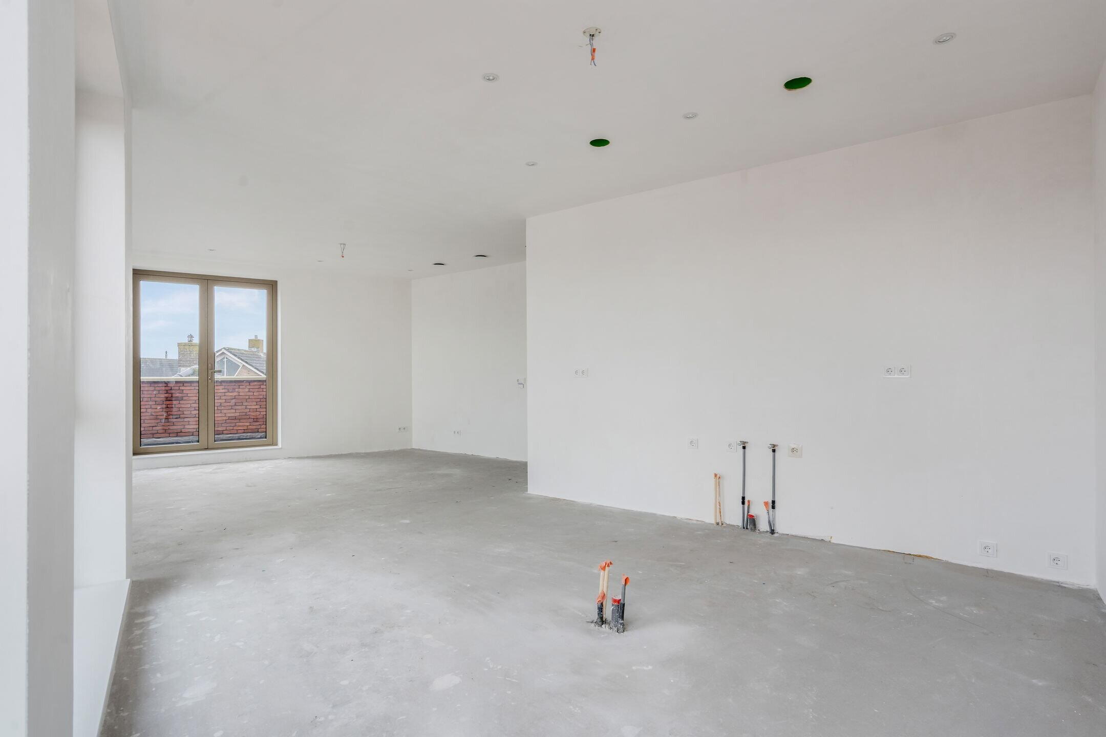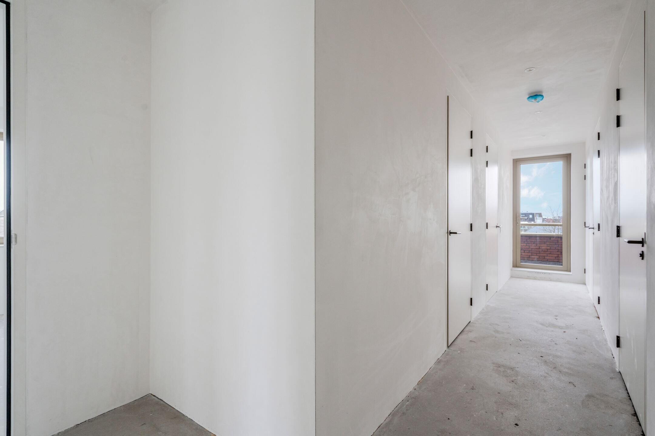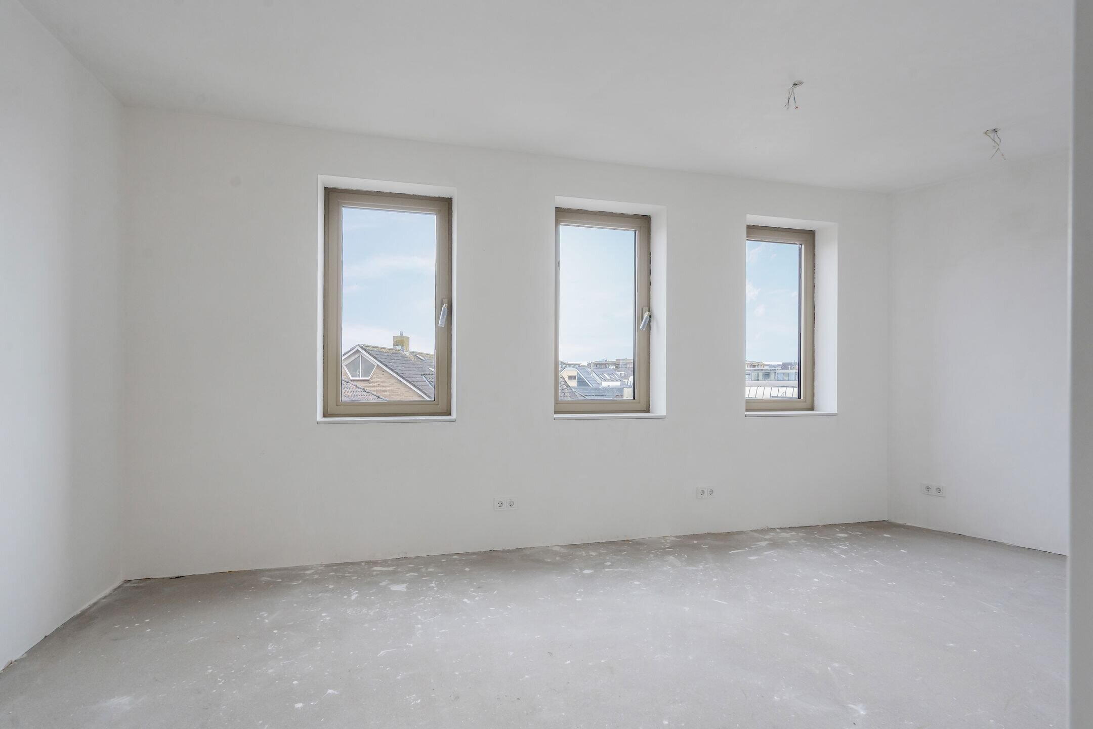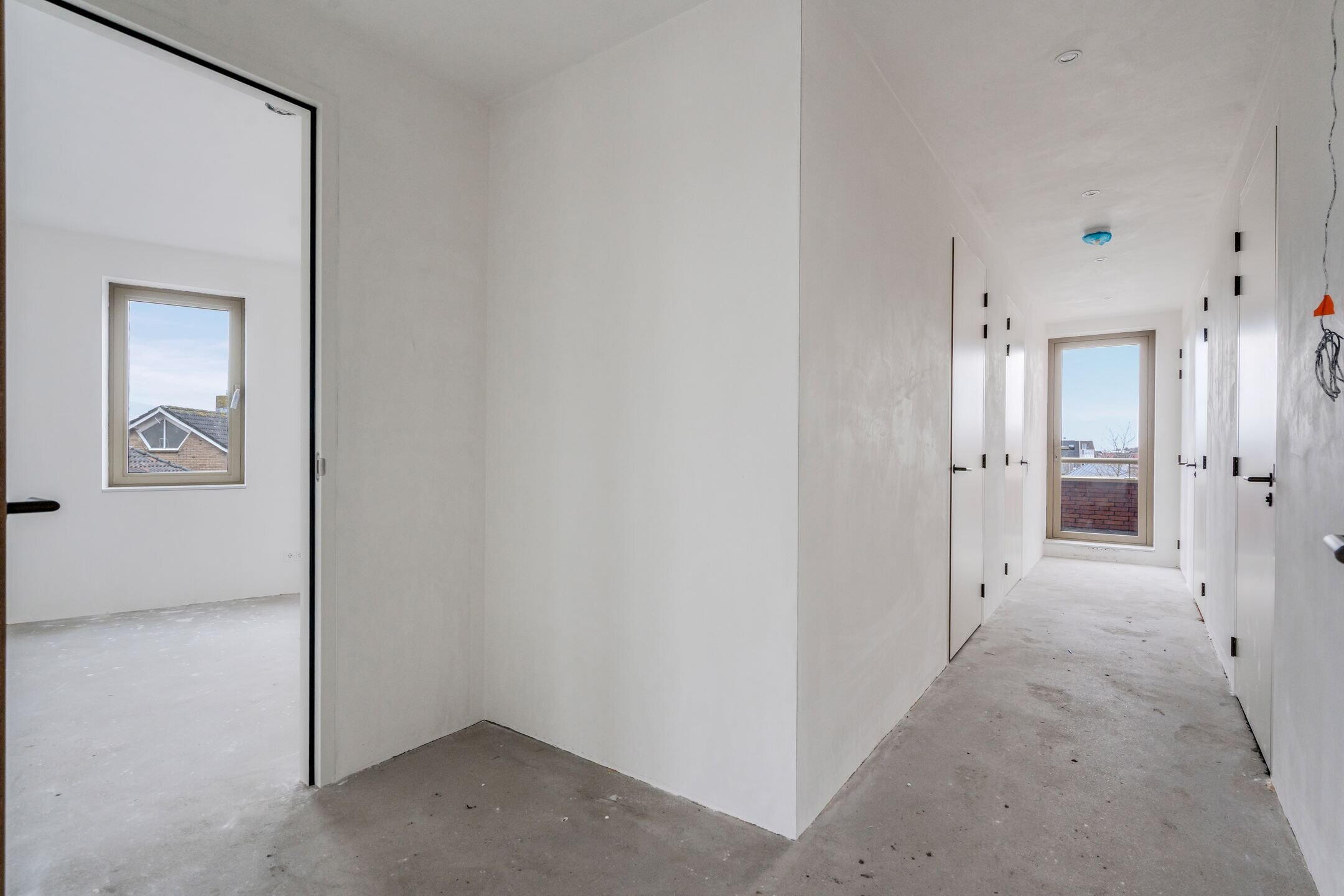 2e etage: ruime entree/hal met toegang tot de royale woonkamer met open keuken, gezamenlijk groot circa 46 m², met directe toegang tot het dakterras van 12 m². Verder beschikt het appartement over drie slaapkamers van respectievelijk circa 8 m², 12 m² en 16 m². Daarnaast zijn er een ruim toilet, een technische ruimte met tevens een praktische bijkeuken en een badkamer met mogelijkheden voor een royale inloopdouche, twee wastafels, een tweede toilet en optioneel een ligbad. Aan het einde van de gang bevindt zich nog een extra balkon.